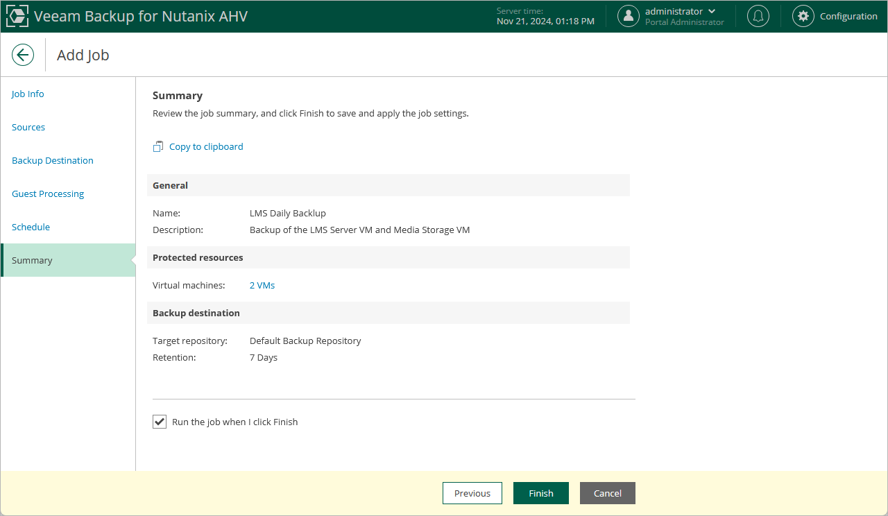 At the Summary step of the wizard, review summary information and click Finish. When Veeam Backup for Nutanix AHV starts the job according to the specified schedule, the backup progress will be displayed on the Session Logs page.