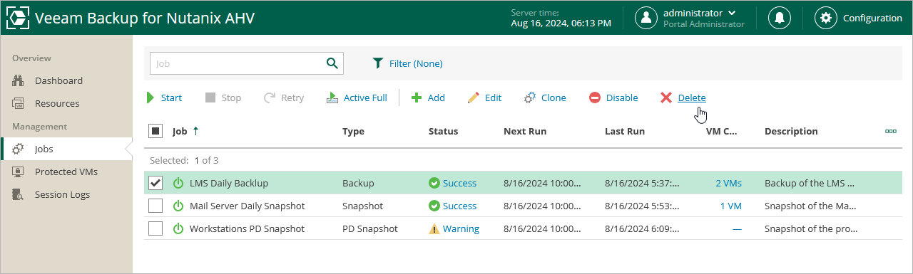 You can permanently delete a job from the Veeam Backup for Nutanix AHV configuration database if you no longer need it. When you delete a job, backups created by this job are displayed under the Backups > Disk (Orphaned) node in the Home view of the Veeam Backup & Replication console. If you want to delete backup files as well, follow the instructions provided in section Deleting Backups.