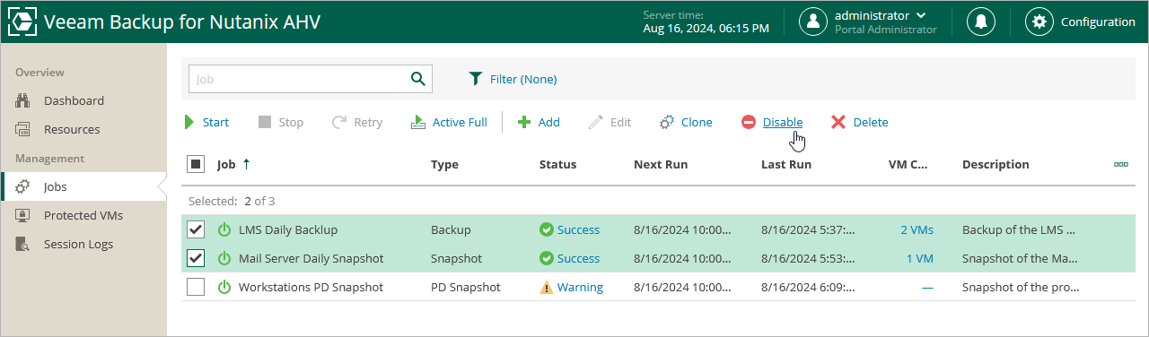 By default, all created jobs run according to the specified schedules. However, you can temporarily disable a job so that it does not run automatically. You will still be able to enable the disabled job at any time you need.