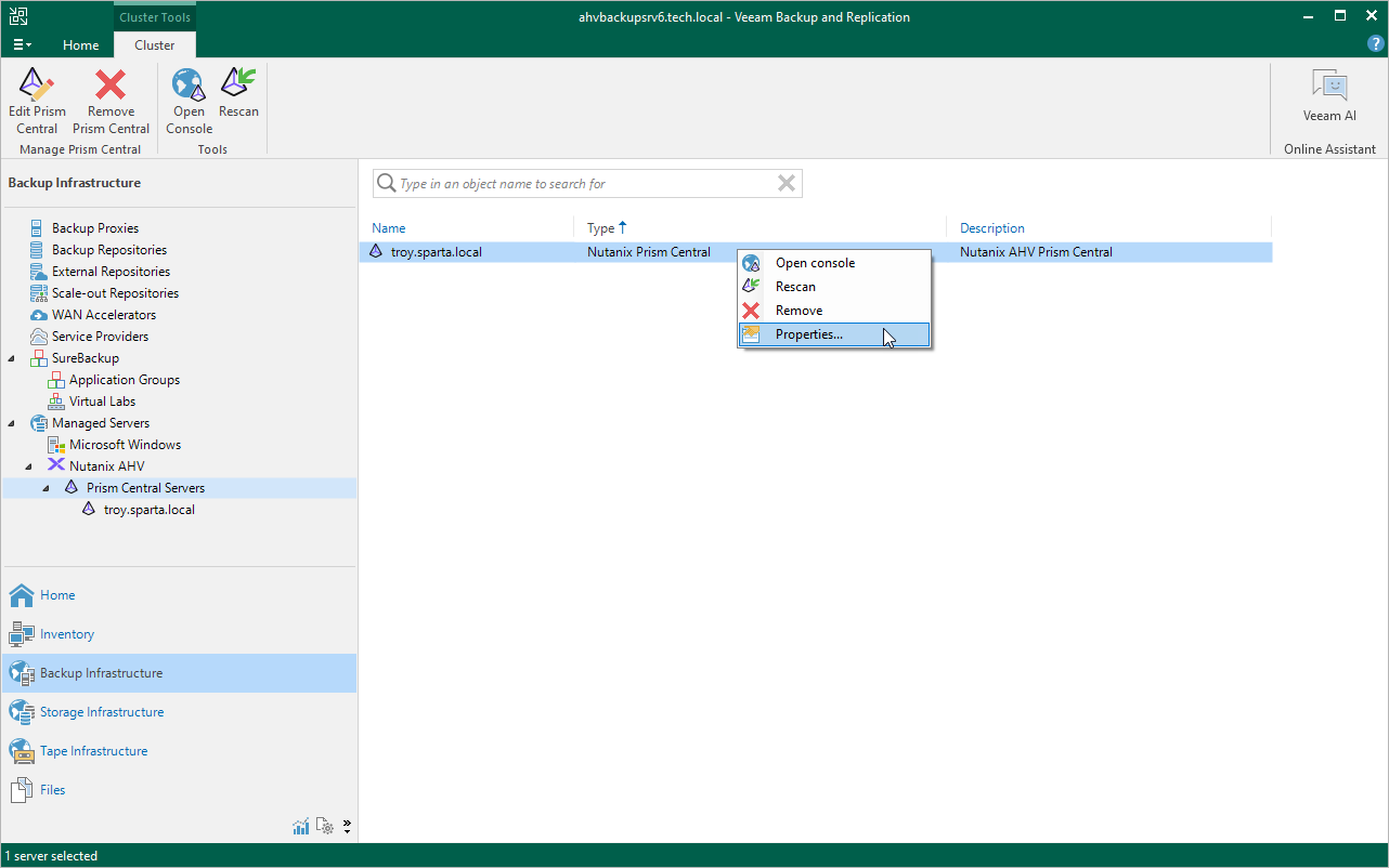- In the working area, select the Prism Central or Nutanix AHV cluster and click Edit on the ribbon, or right-click the Nutanix AHV cluster and select Properties.