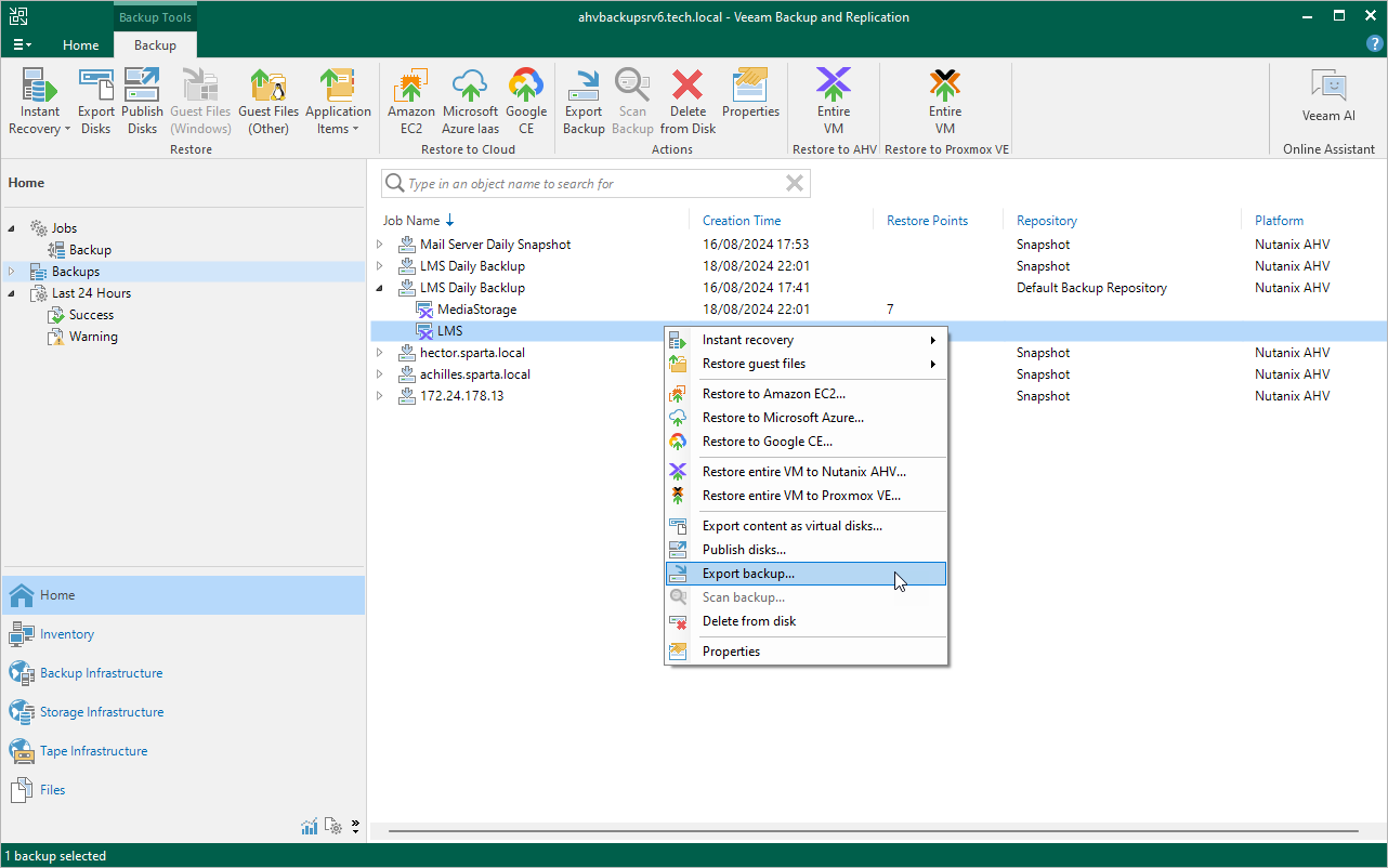 - In the working area, right-click a VM for which you want to synthesize a full backup file, and select Export Backup.