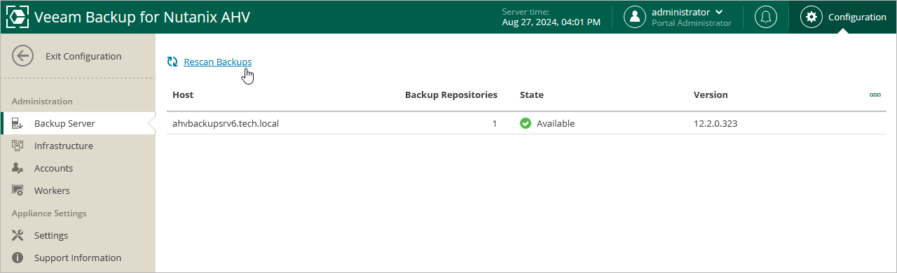 When you import backups, the jobs that produced those backups are not re-created. To re-create the jobs, restore the Nutanix AHV backup appliance configuration as described in section Restoring Configuration Settings. |