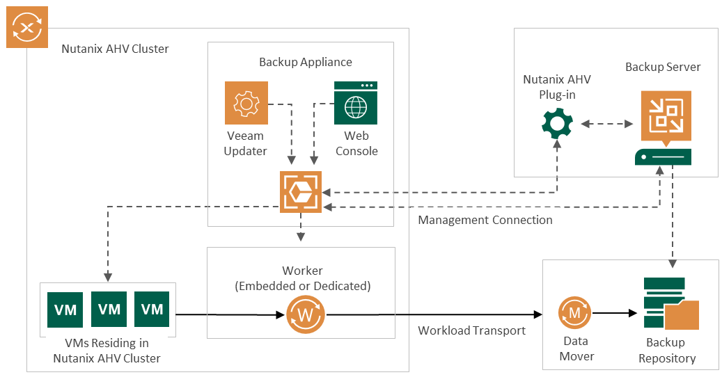 The backup appliance is an architecture component that sits logically between the backup server and other components of the backup infrastructure. While the backup server administers tasks, the backup appliance performs management operations, processes jobs and delivers backup traffic. The backup appliance is a Linux-based VM that resides in the Nutanix AHV cluster and includes the following components: