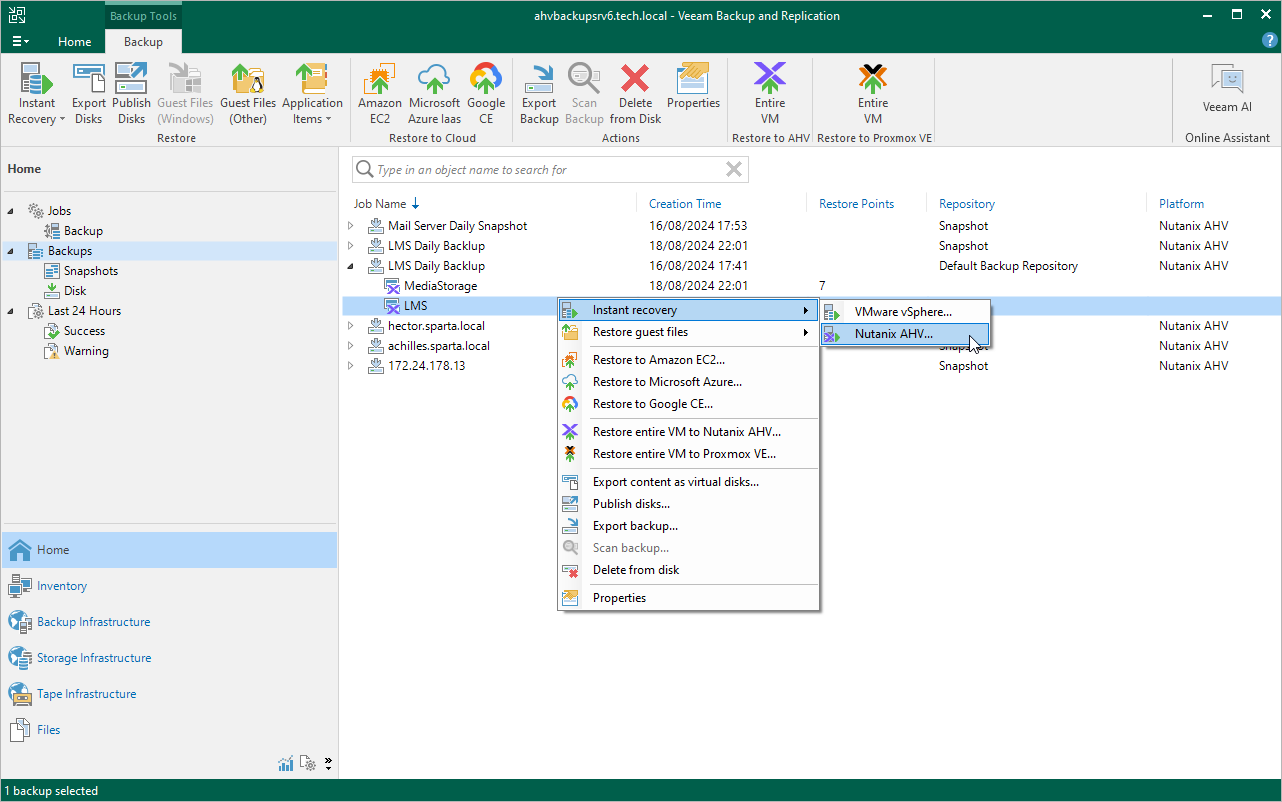 - In the working area, expand the necessary backup, select the VM that you want to restore and click Instant Recovery > Nutanix AHV on the ribbon, or right-click the VM and select Instant Recovery > Nutanix AHV.