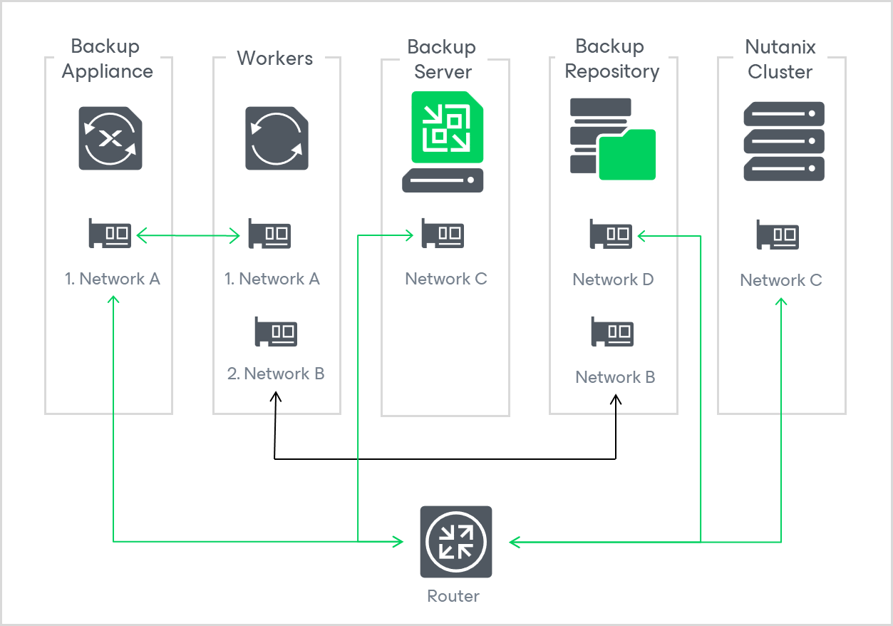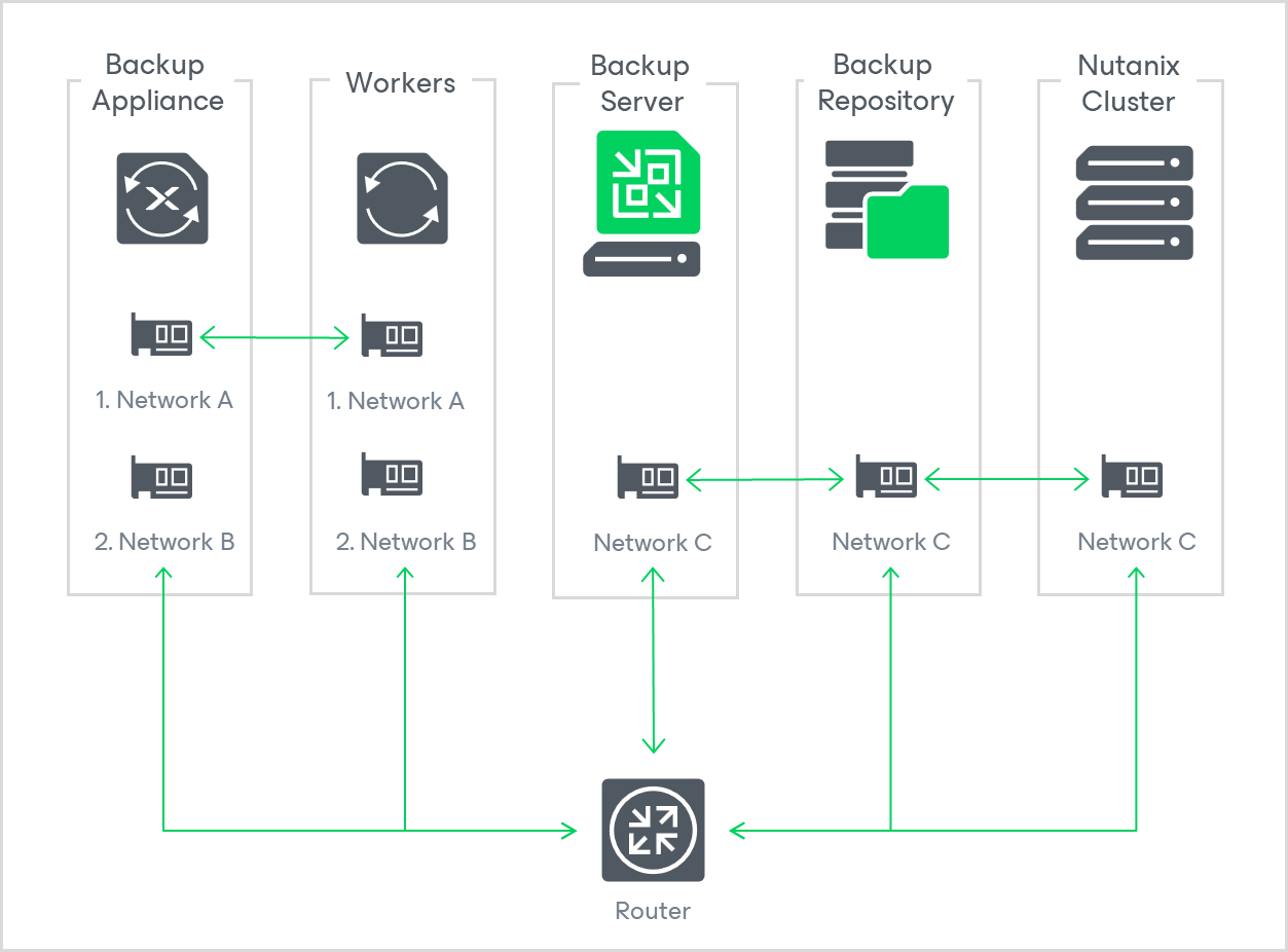 In this example, the backup appliance and all workers are connected both to Network A using their first vNICs and to Network B using their second vNICs, while the backup server, the backup repository and the Nutanix cluster are connected to Network C. Also, you have a router configured to forward traffic between networks B and C. This configuration is invalid since the workers and the backup appliance cannot use Network B to communicate with other backup infrastructure components through the router.