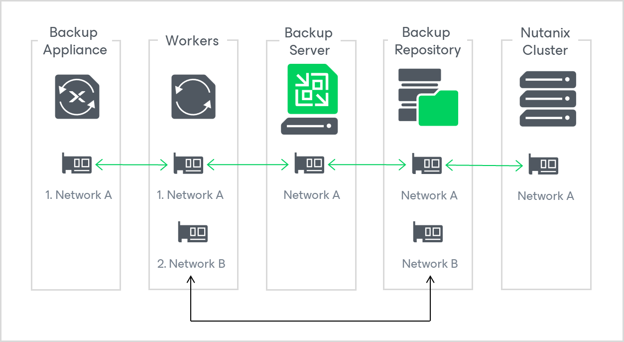 In this example, the backup appliance, all workers, the backup server, the repository and the Nutanix AHV cluster are connected to Network A, while the workers and the backup repository are also connected to Network B that is configured as a preferred network to deliver traffic to the backup repository. This configuration is valid since all backup infrastructure components are connected to the same network.
