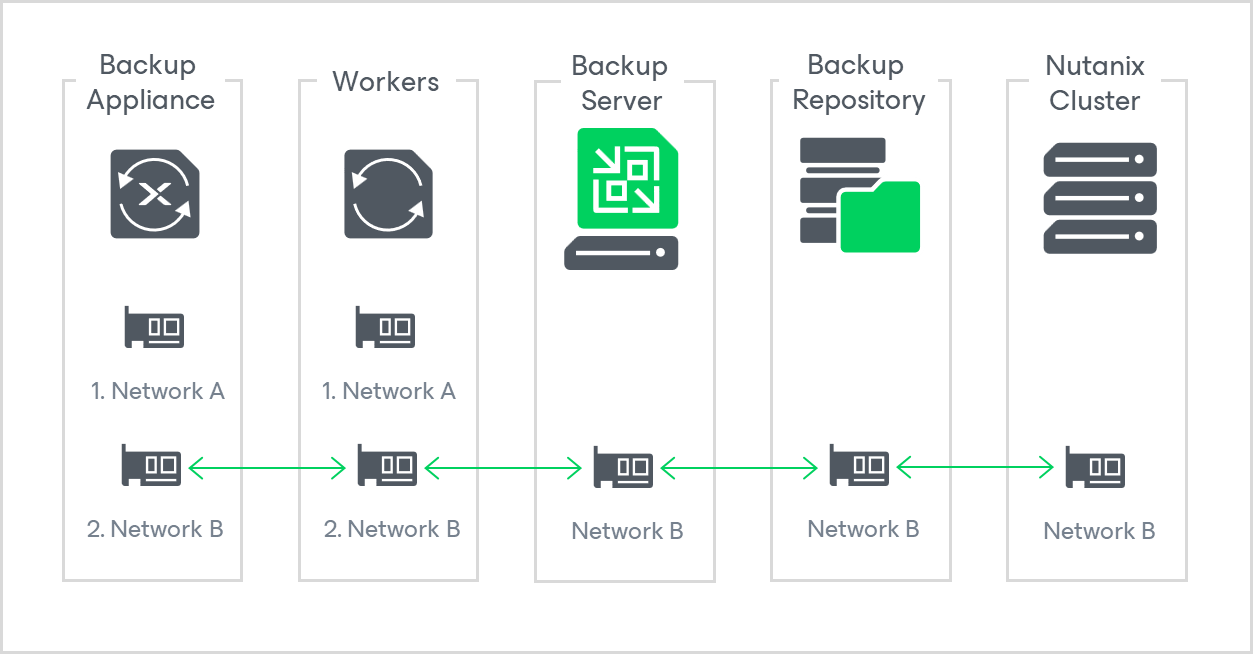 - If a backup repository, the backup server, the Nutanix AHV cluster or the Prism Central is not reachable from the network connected to the first vNIC, you must update the backup appliance and worker settings to add one more vNIC and to connect it to the network to which that component is connected.