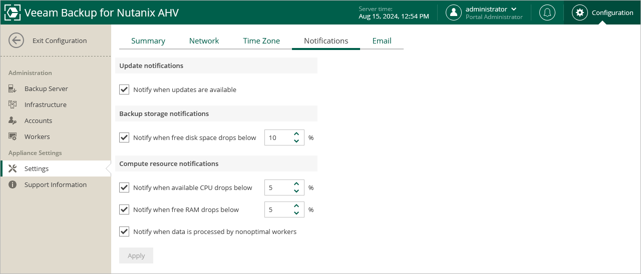 You can find backup storage and compute resource notifications in backup job session logs. Update notifications appear at the top right corner of the Veeam Backup for Nutanix AHV window next to the user name.