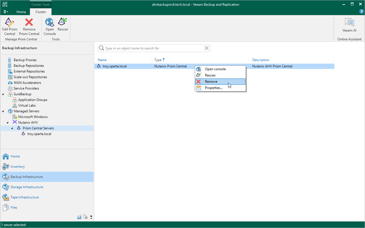 - In the working area, select the Prism Central or Nutanix AHV cluster and click Remove on the ribbon, or right-click the Prism Central or Nutanix AHV cluster and select Remove.