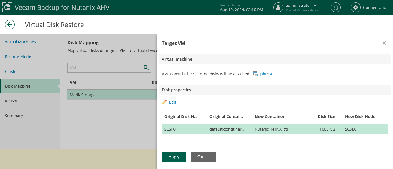 By default, Veeam Backup for Nutanix AHV attaches the restored disk to the target VM as a new disk. However, if you want the restored disk to replace the existing disk, or if you want to change the disk bus type and to specify a storage container for the restored disk, configure disk settings.