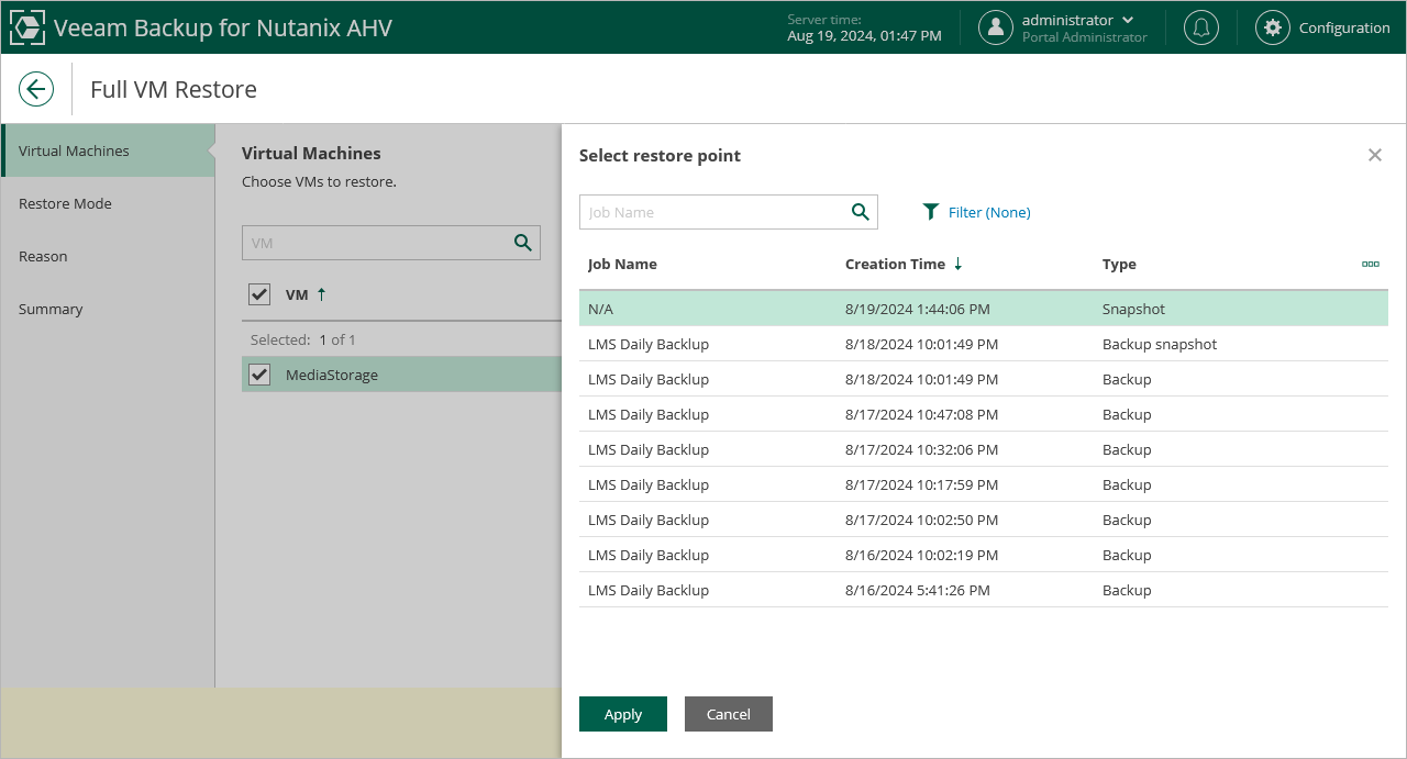 To help you choose a restore point, Veeam Backup for Nutanix AHV provides the following information on each available restore point: