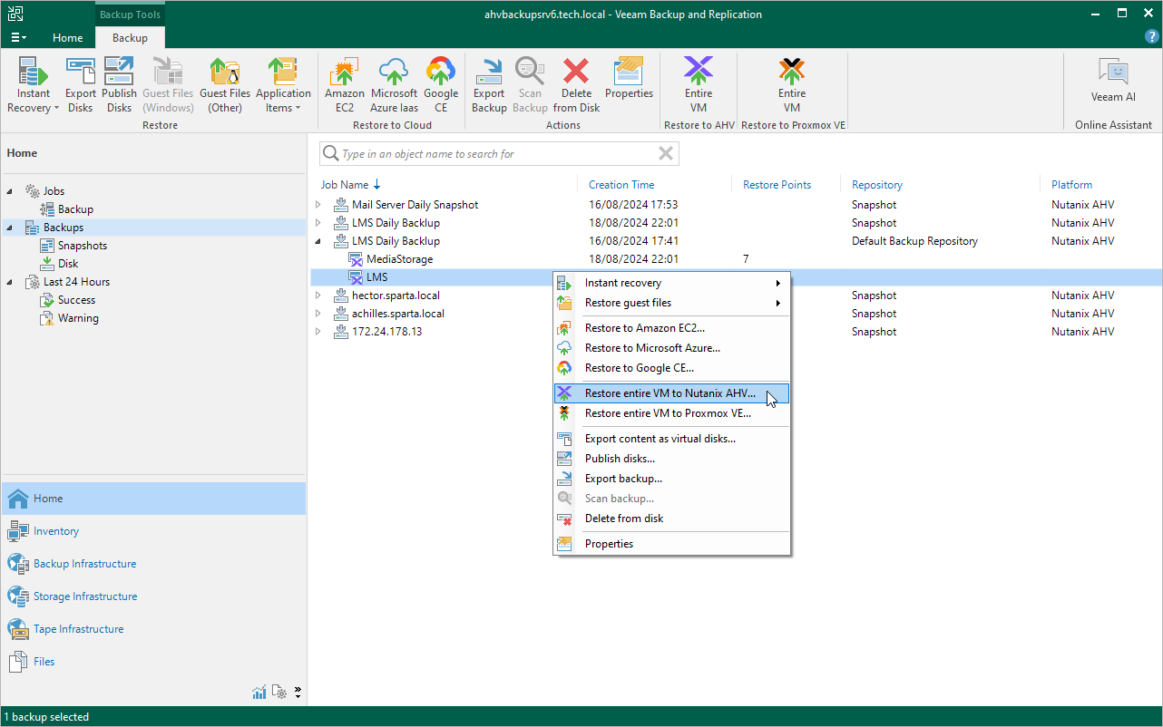 - In the working area, expand the necessary backup or snapshot job, select the VM that you want to restore and click Entire VM on the ribbon, or right-click the VM and select Restore entire VM to Nutanix AHV.