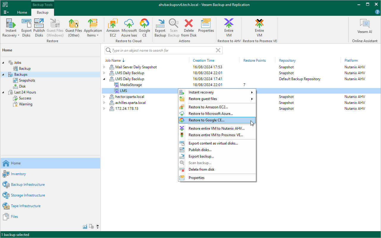 3. In the working area, expand the necessary backup job, right-click the VM that you want to restore and select Restore to Google CE.