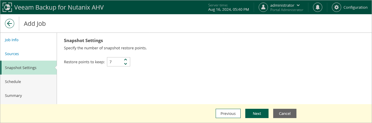 At the Snapshot Settings step of the wizard, specify the number of restore points that you want to keep in a snapshot chain.