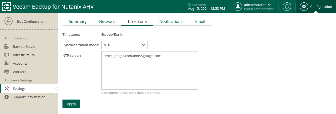 As the backup appliance time zone is automatically synchronized with the backup server time zone, it cannot be changed manually in the Nutanix AHV backup appliance web console. |