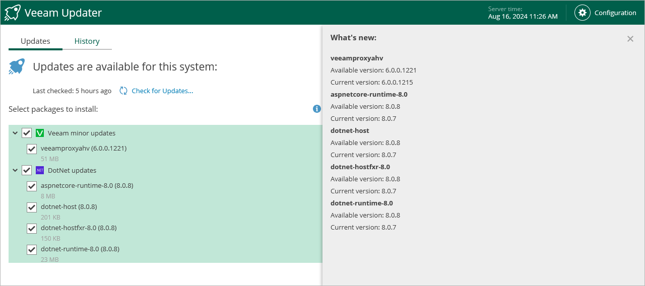 If new updates are available, Veeam Backup for Nutanix AHV will display them on the Updates tab of the Veeam Backup Updater page. To view detailed information on an update, select the check box next to the update and click What's new?