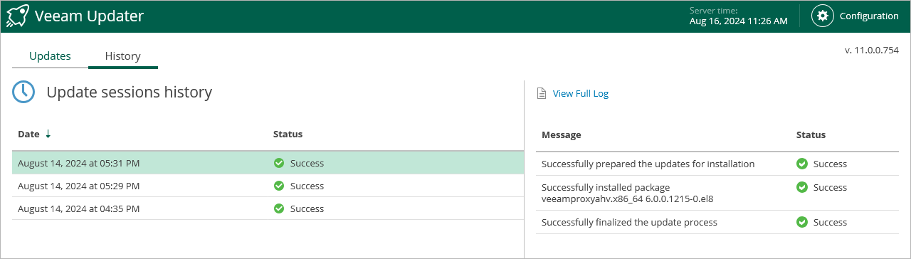 For each date when an update was installed, the Veeam Updater page will display the name of the update and its status (whether the installation process completed successfully, completed with warnings or failed to complete).