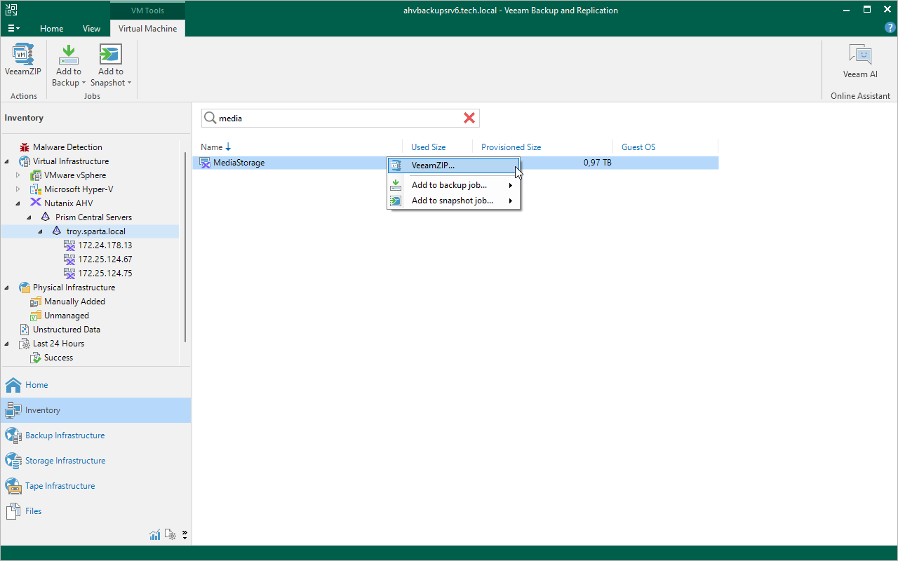 - It the working area, right-click the VM that you want to back up, and select VeeamZIP.