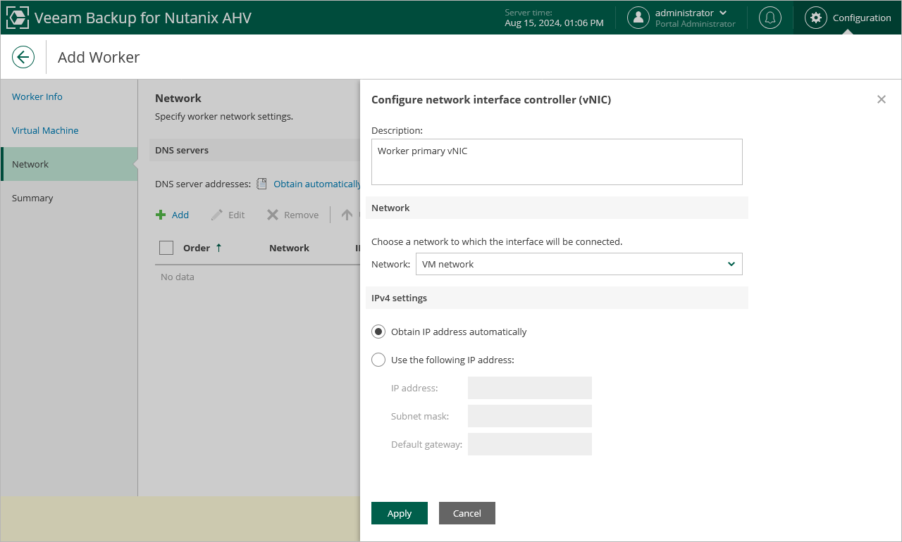 If DHCP is disabled in the selected network, or you want to specify an IP address, select the Use the following IP address option and enter the worker IP address, subnet mask and default gateway.