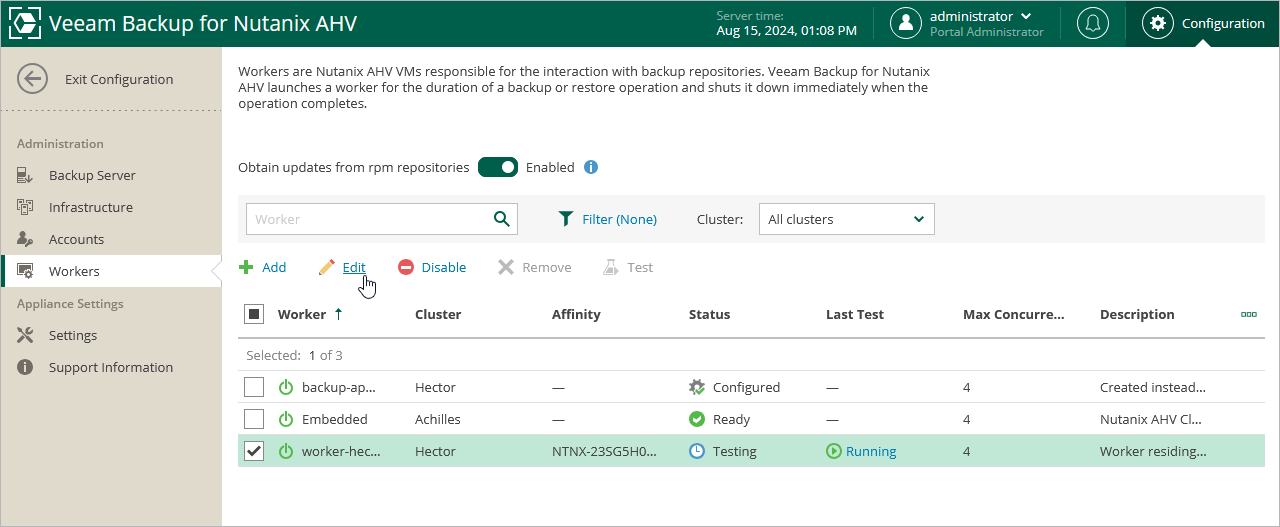 It is not recommended that you change the worker cluster, decrease the amount of allocated resources, adjust the affinity settings or modify the network settings while the worker is currently transferring data. In this case, Veeam Backup for Nutanix AHV will terminate the related operations, power off the worker and update the settings immediately. |