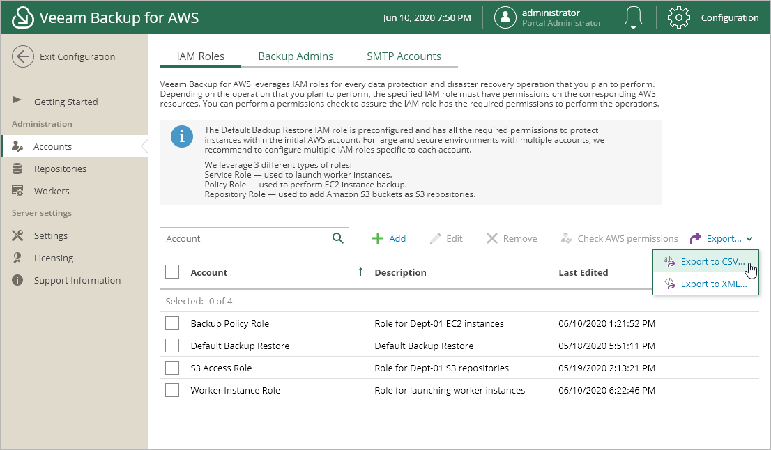 - At the top right corner of the Veeam Backup for AWS window, click Configuration.