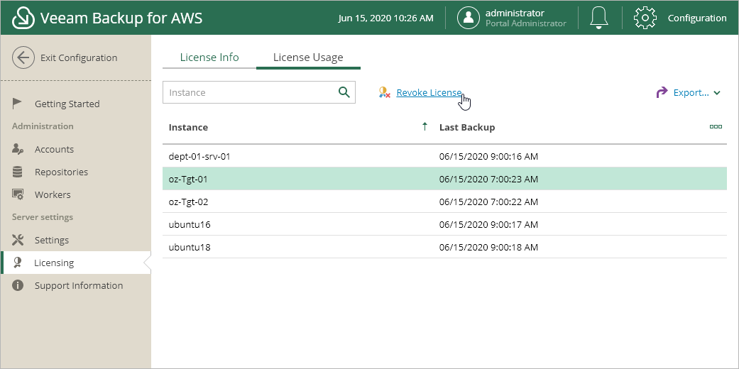 - On the License Usage tab, select the necessary EC2 instance from the list, and then click Revoke License. Veeam Backup for AWS will revoke a license unit from the selected EC2 instance, and the license unit will be freed for other EC2 instances that you plan to protect.