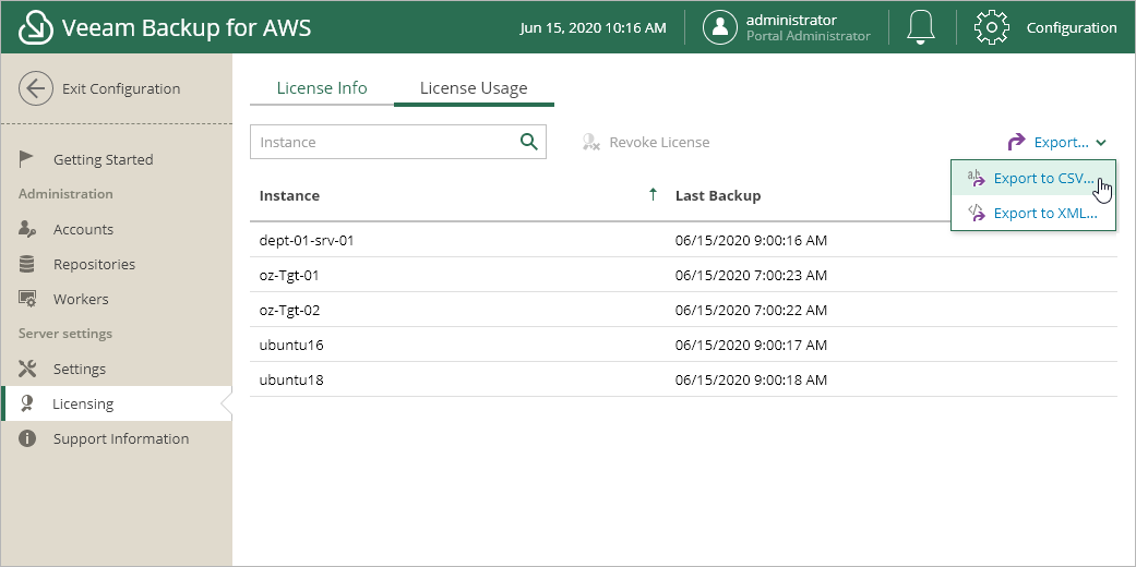 To export the list of EC2 instances that consume license units, on the License Usage tab, click Export and select a format of the exported data: