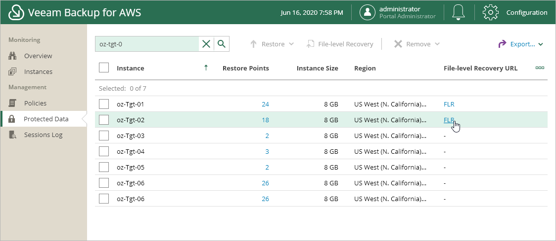 - On the right of the necessary EC2 instance, in the File-level Recovery URL column, click the FLR link.