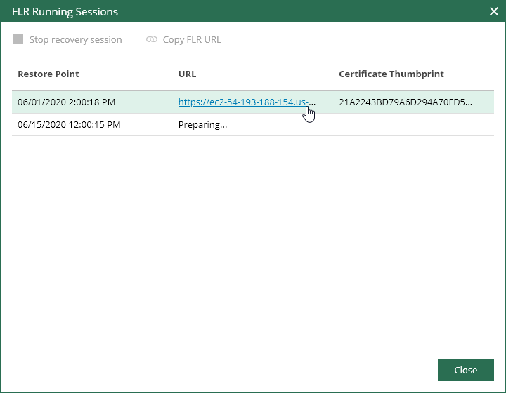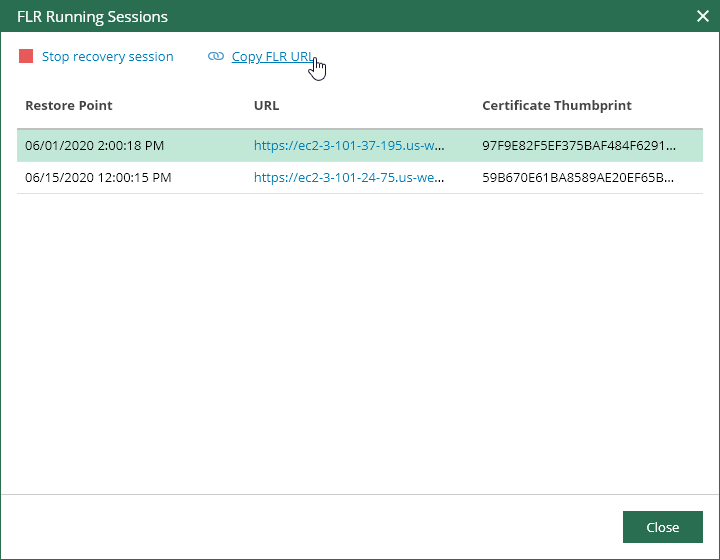 You can copy the information that is required to open the Veeam Backup browser on another machine. To do that, in the FLR Running Sessions window, click the Copy FLR URL link.