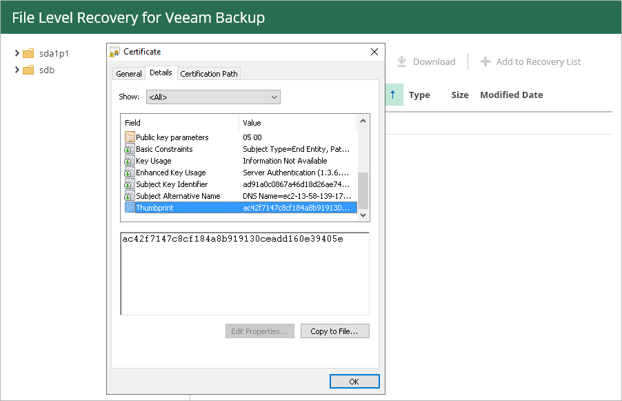To avoid the man-in-the-middle attack, before you restore files and folders, check that the certificate thumbprint displayed in the web browser from which you access the Veeam Backup browser matches the provided certificate thumbprint.
