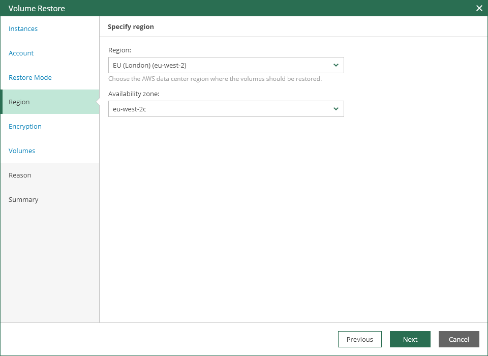 This is an archive version of the document. To get the most up-to-date information, see the current version. Step 6. Select AWS Region and Availability Zone At the Region step of the wizard, select the AWS region and Availability Zone to which Veeam Backup for AWS will place the restored EBS volumes.