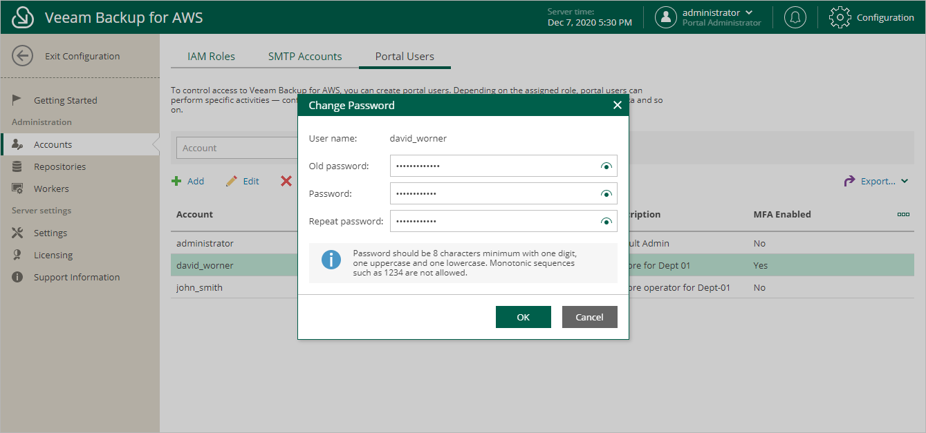For Veeam Backup for AWS user accounts, you can change the password specified while creating the account: