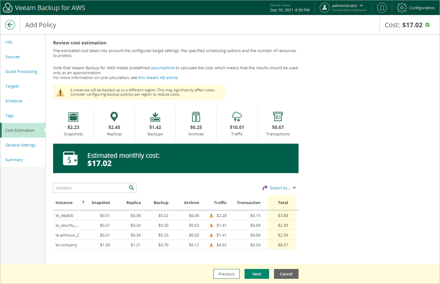 At the Cost Estimation step of the wizard, review the estimated monthly cost of AWS services and resources that will be consumed to protect the instances added to the backup policy. The total estimated cost includes the following: