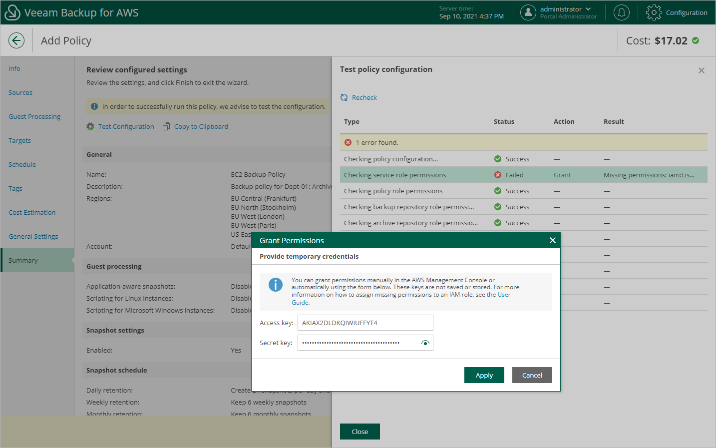 It is recommended that you run the backup policy configuration check to verify whether specified IAM roles have all the required permissions, and networks settings are configured properly to launch worker instances. To run the configuration check, click Test Configuration. Veeam Backup for AWS will display the Test policy configuration window where you can view the progress and results of the performed check. If the IAM role permissions are insufficient or worker instance settings are not configured properly, the check will complete with errors.