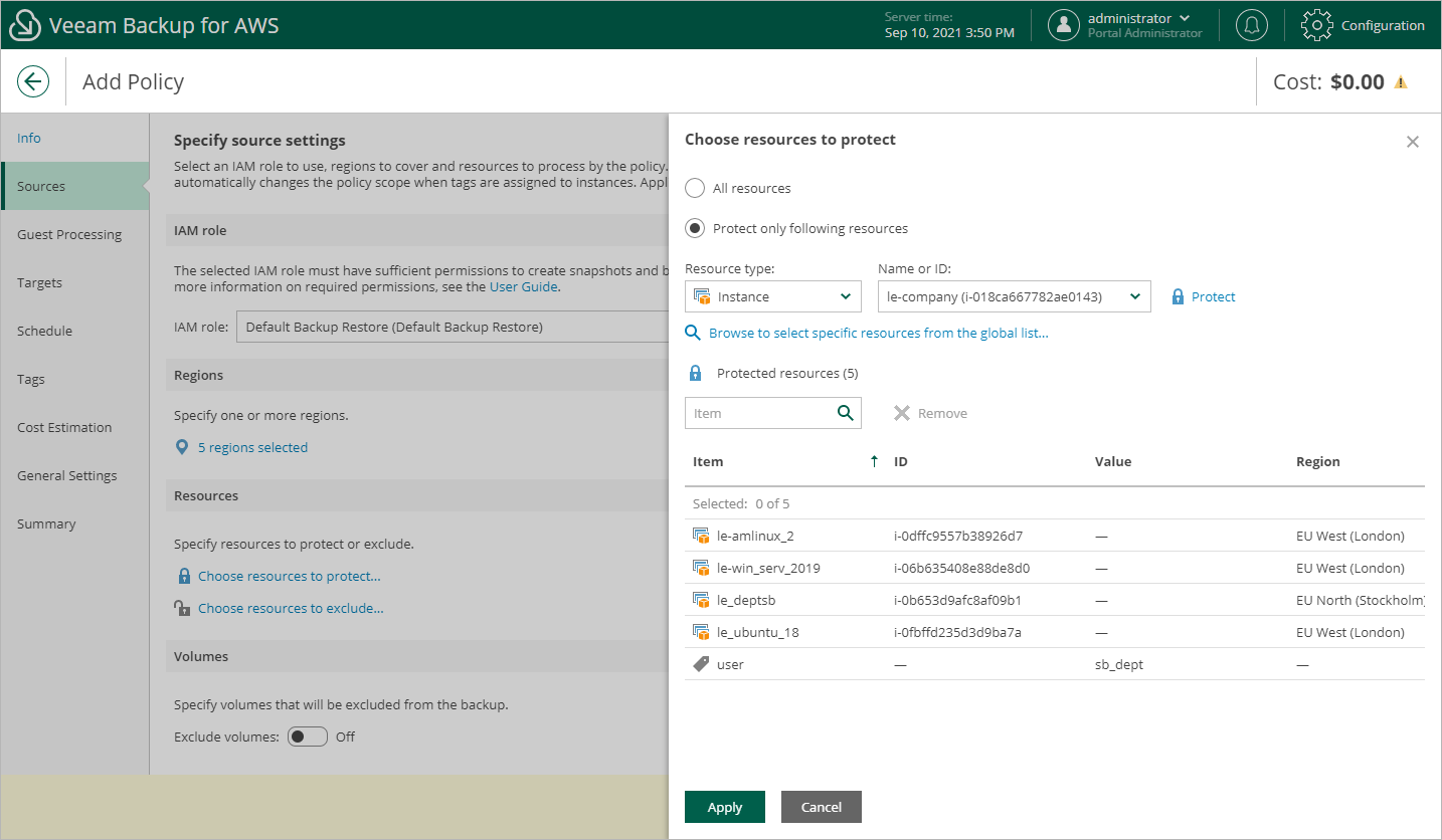 If you add an AWS tag to the backup scope, Veeam Backup for AWS will regularly check for new EC2 instances assigned the added AWS tag and automatically update the backup policy settings to include these instances in the scope. However, this applies only to EC2 instances from the regions selected at step 3.2. If you select a tag assigned to EC2 instances from other regions, these instances will not be protected by the backup policy. To work around the issue, either go back to step 3.2 and add the missing regions, or create a new backup policy.