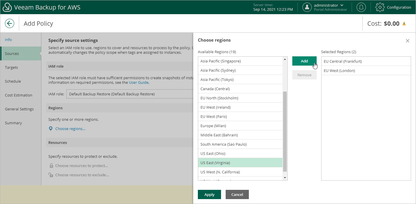 - In the Choose regions window, select the necessary regions, click Add to include them in the backup policy.