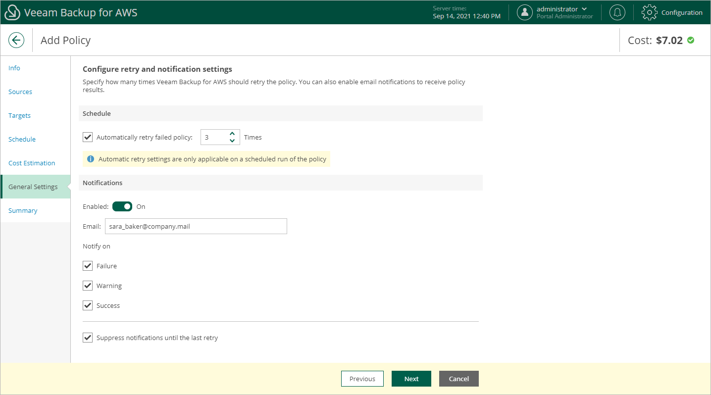 If you do not select the check box, Veeam Backup for AWS send a notification for every backup policy retry.