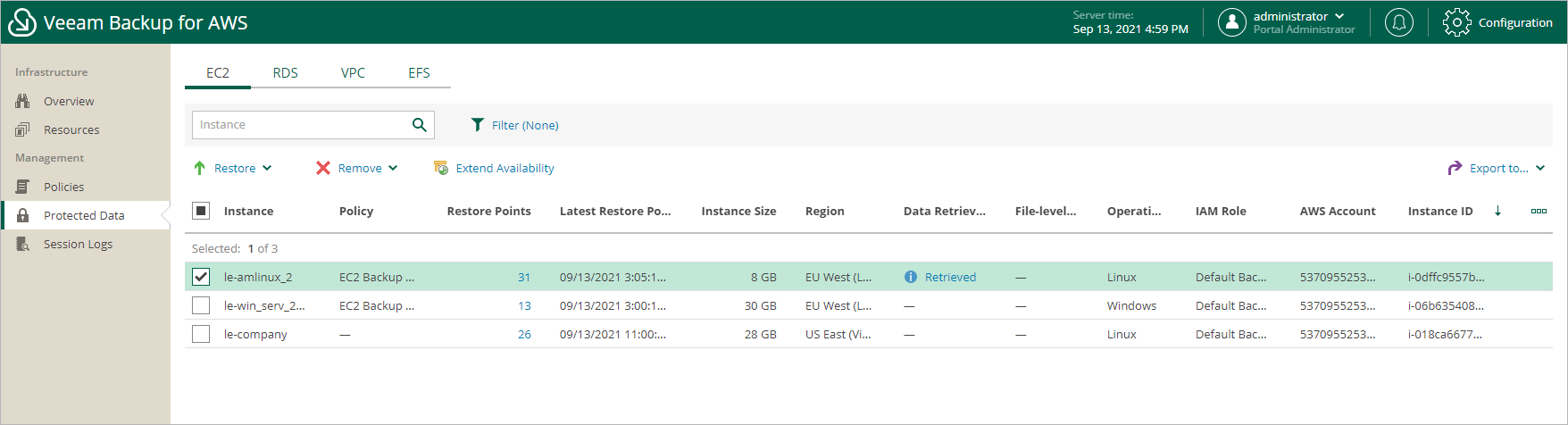 To view and manage backed-up EC2 instance data, navigate to Protected Data > EC2. The EC2 tab displays information on all protected EC2 instances and allows you to remove restore points of the instances if you no longer need them.