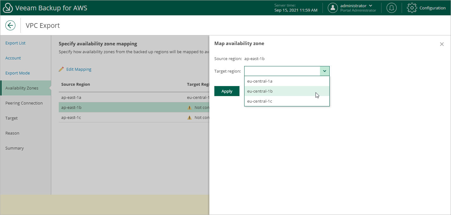 At the Availability Zones step of the wizard, for each source Availability Zone, choose an Availability Zone in the target AWS Region where VPC configuration items of the source Availability Zone will be restored: