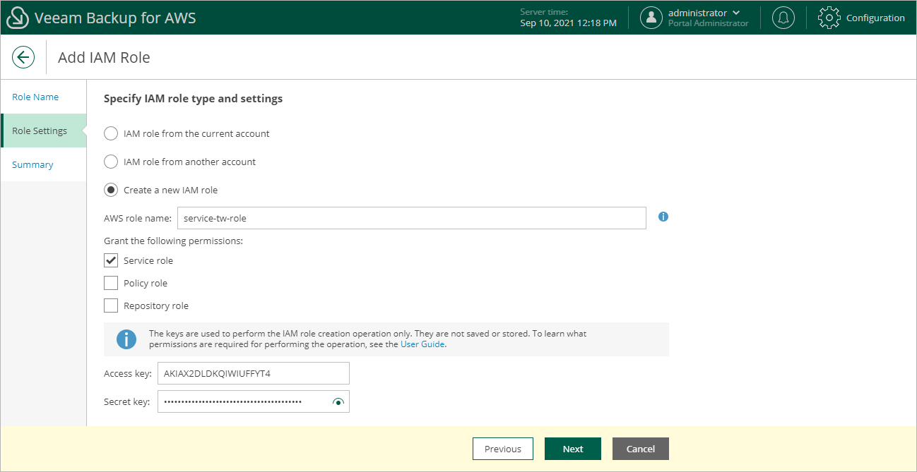- Repository role — select this check box to grant permissions sufficient to add Amazon S3 buckets as backup repositories.