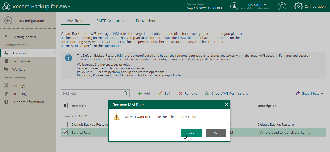 You can remove an IAM role from Veeam Backup for AWS if it is no longer used to perform data protection and disaster recovery operations.