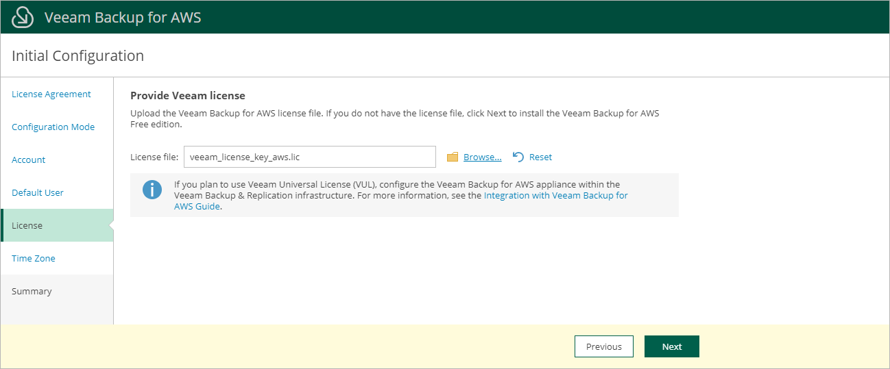 At the License step of the wizard, browse to the license file supplied to you by Veeam. You will still be able to proceed with the wizard without providing a license — in this case, the Free edition of Veeam Backup for AWS will be installed.