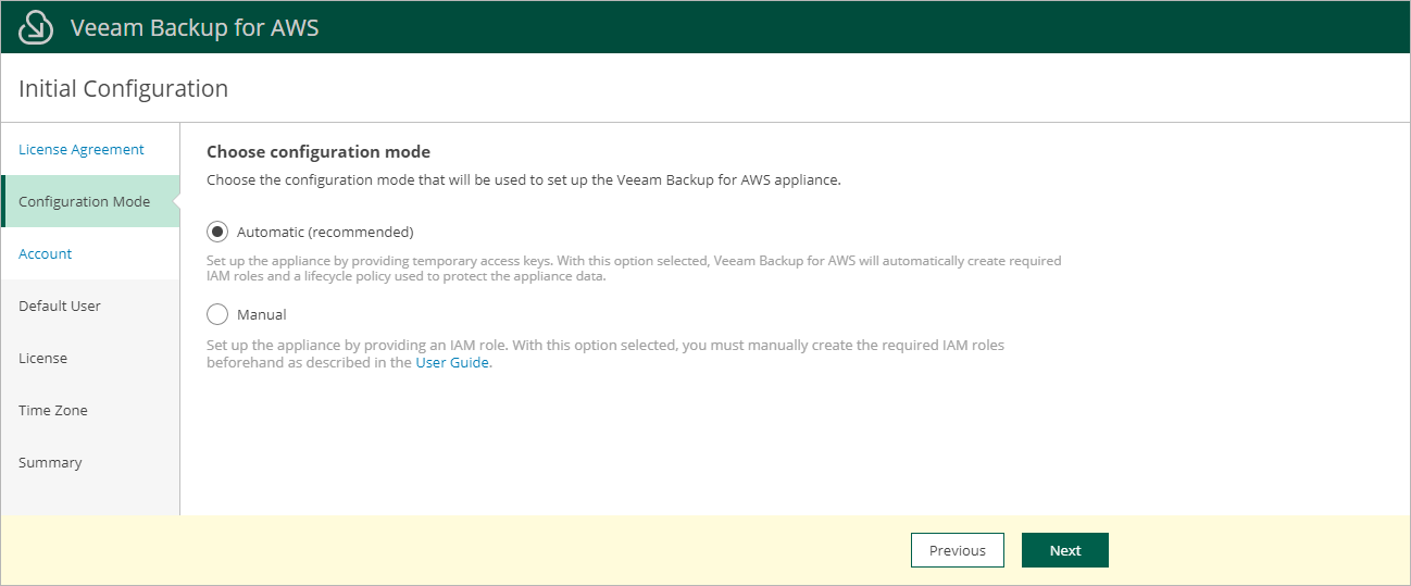 At the Configuration Mode step of the wizard, choose whether you want to instruct Veeam Backup for AWS to automatically create IAM roles required for the backup appliance configuration, or you want to specify an IAM role created manually.