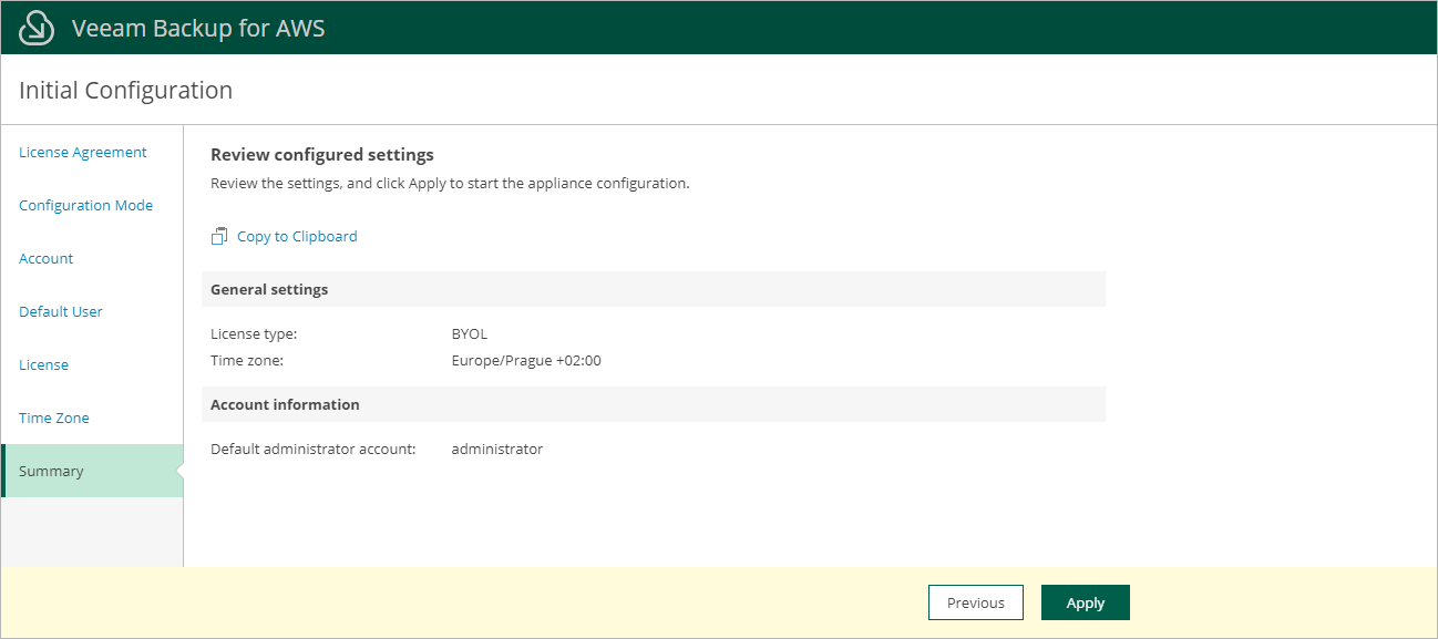 At the Summary step of the wizard, review configuration settings and click Finish. After the initial configuration process completes, Veeam Backup for AWS will display the welcome screen where you can log in.