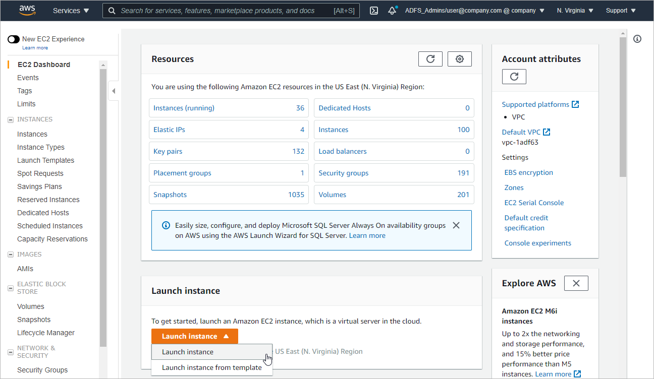 - On the EC2 Dashboard tab, click Launch instance > Launch instance. The launch instance wizard will open.