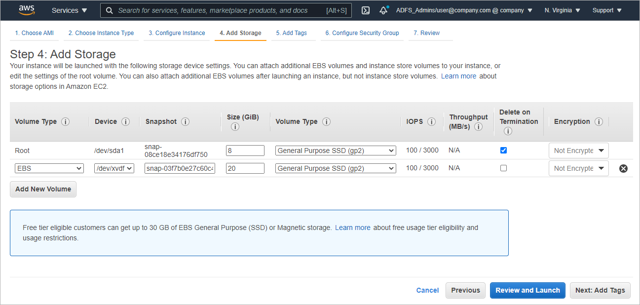 - At the Add Storage step of the wizard, review the preconfigured storage settings and click Next: Add Tags. For technical reasons, it is not recommended to change these settings.
