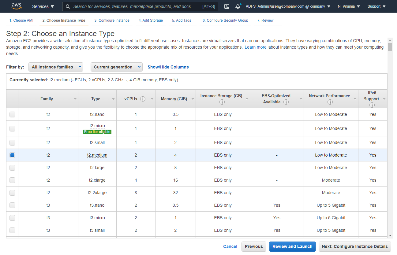 - At the Choose an Instance Type step of the wizard, select an EC2 instance type for the backup appliance. The minimum recommended EC2 instance type is t2.medium.