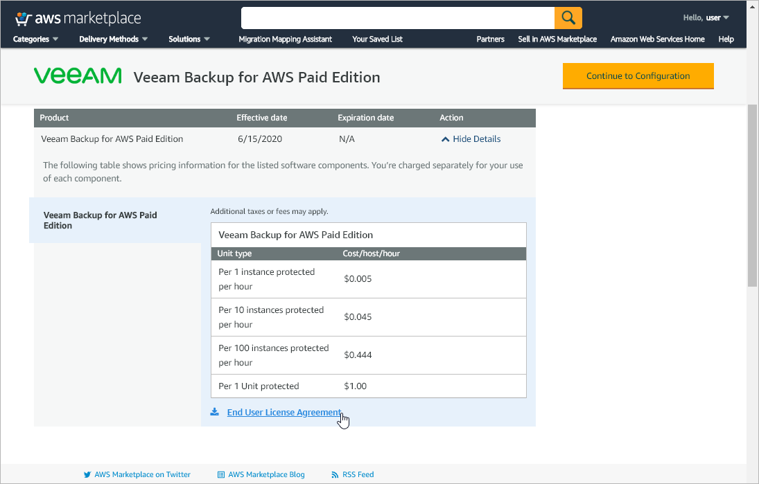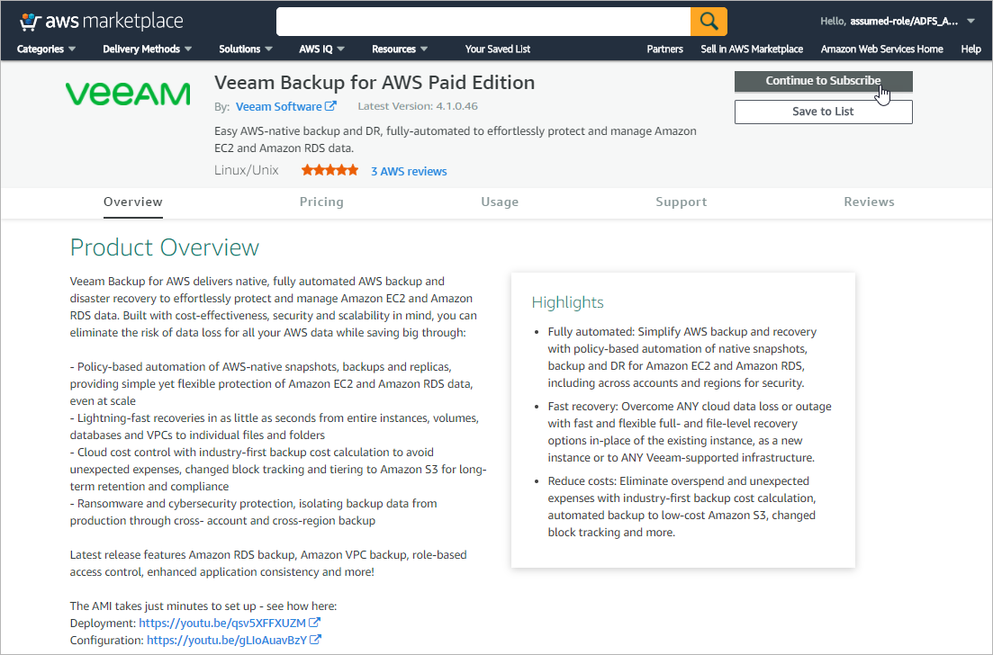 - Log in to AWS Marketplace using credentials of an AWS account in which you plan to install Veeam Backup for AWS.