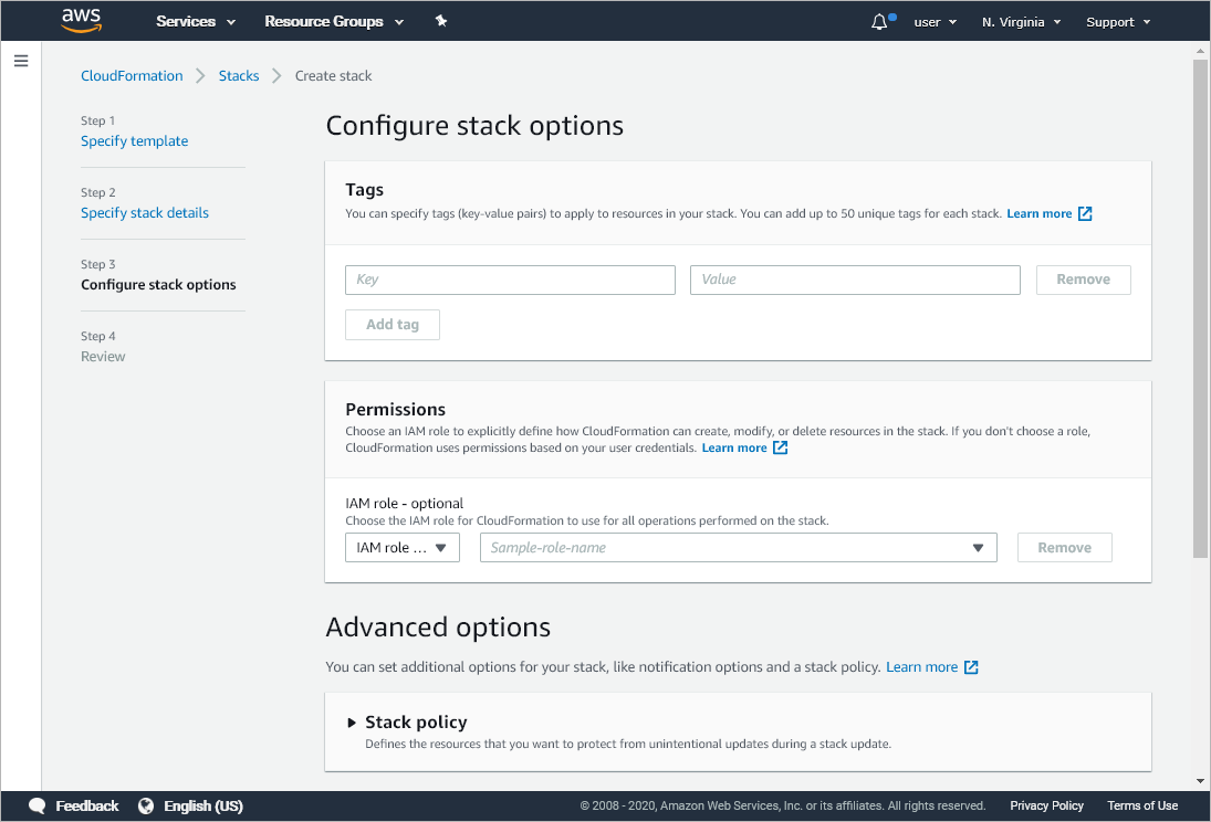- At the Configure stack options step of the wizard, specify AWS tags, IAM role permissions and other additional settings for the stack.