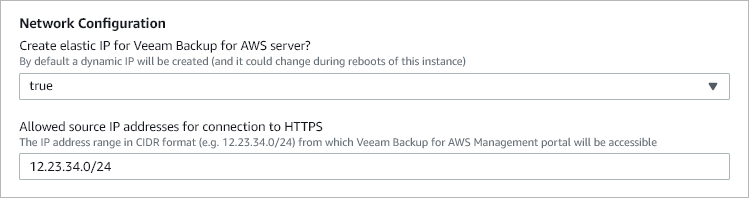 - Select true if you want to create an Elastic IP address for the backup appliance.